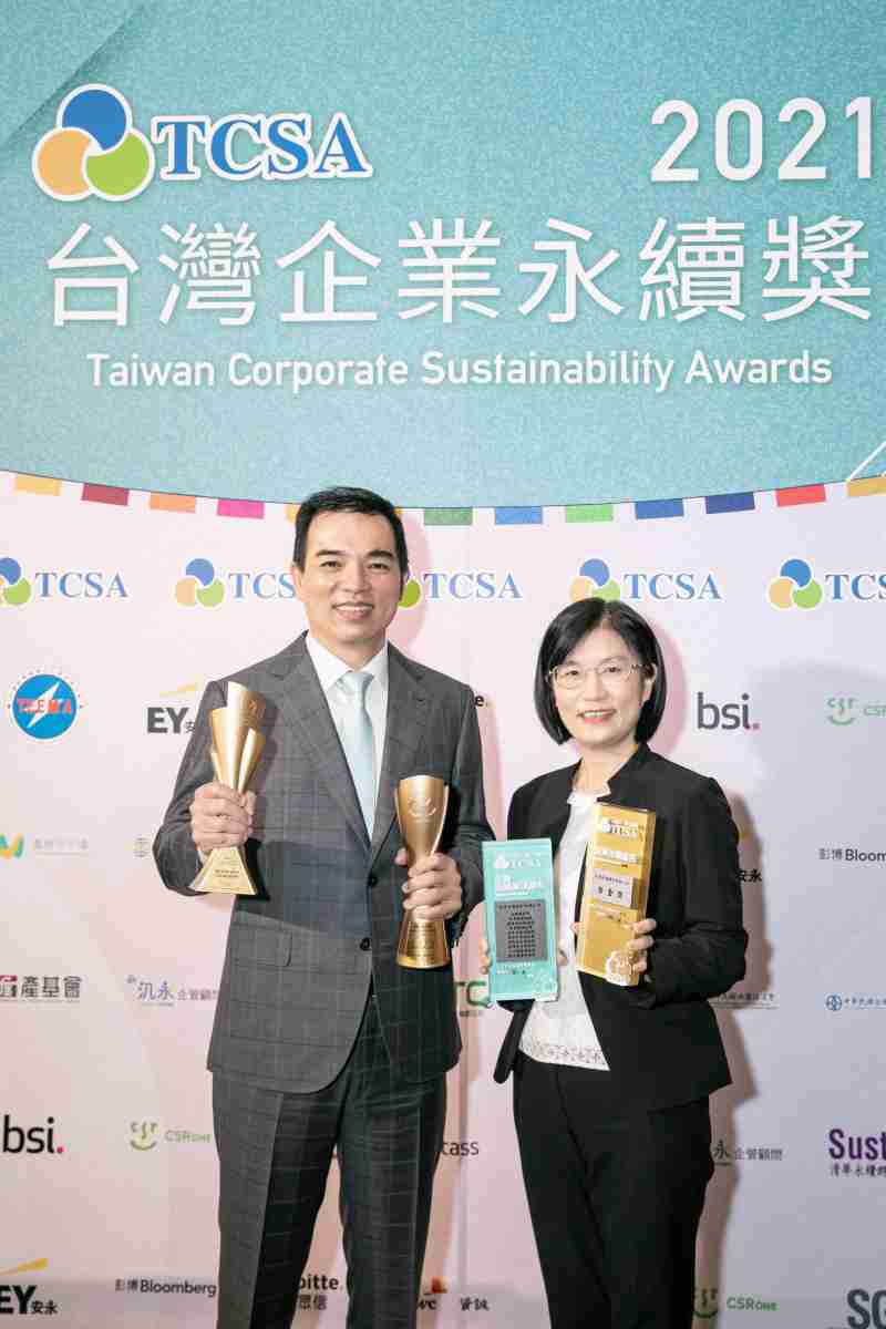 达在台湾永续奖所评比环境、、社会、、、治理等各面向的永续绩效均获高度肯定 (左:人生就是博光电总经理暨营运长柯富仁,,,右:人生就是博光电永续长古秀华)